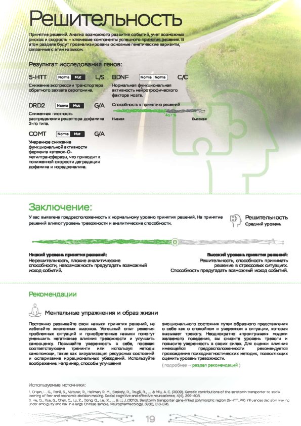 Этот ДНК анализ показывает влияние наиболее важных 10 генов на психическое и эмоциональное состояние. Именно они регулируют выработку гормонов, работу нейромедиаторов. Используйте знания о природных свойствах своего организма для борьбы со стрессом, повышения работоспособности и общего тонуса. Каждый человек индивидуален, поэтому мы рекомендуем пройти наш генетический нейро тест в Магнитогорске.